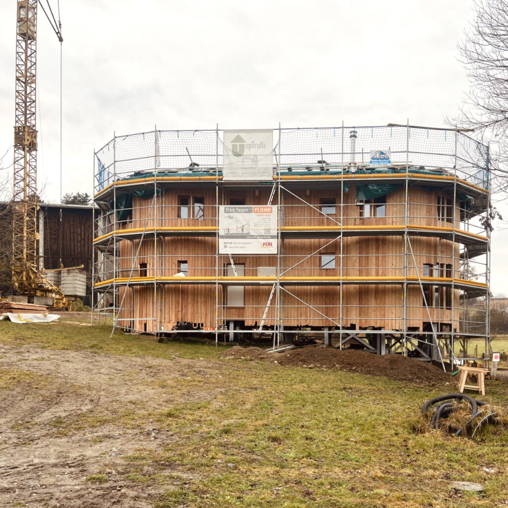 Aufgerichtet sind Wände und Dachstuhl, im Innenraum sind die Wände mit Lehmsteinen ausgemauert und die Roh-Installationen von Sanitär und Elektro erfolgt. Die Fenster sind eingebaut und die Fassade im unbehandelten Lärcheholz montiert.